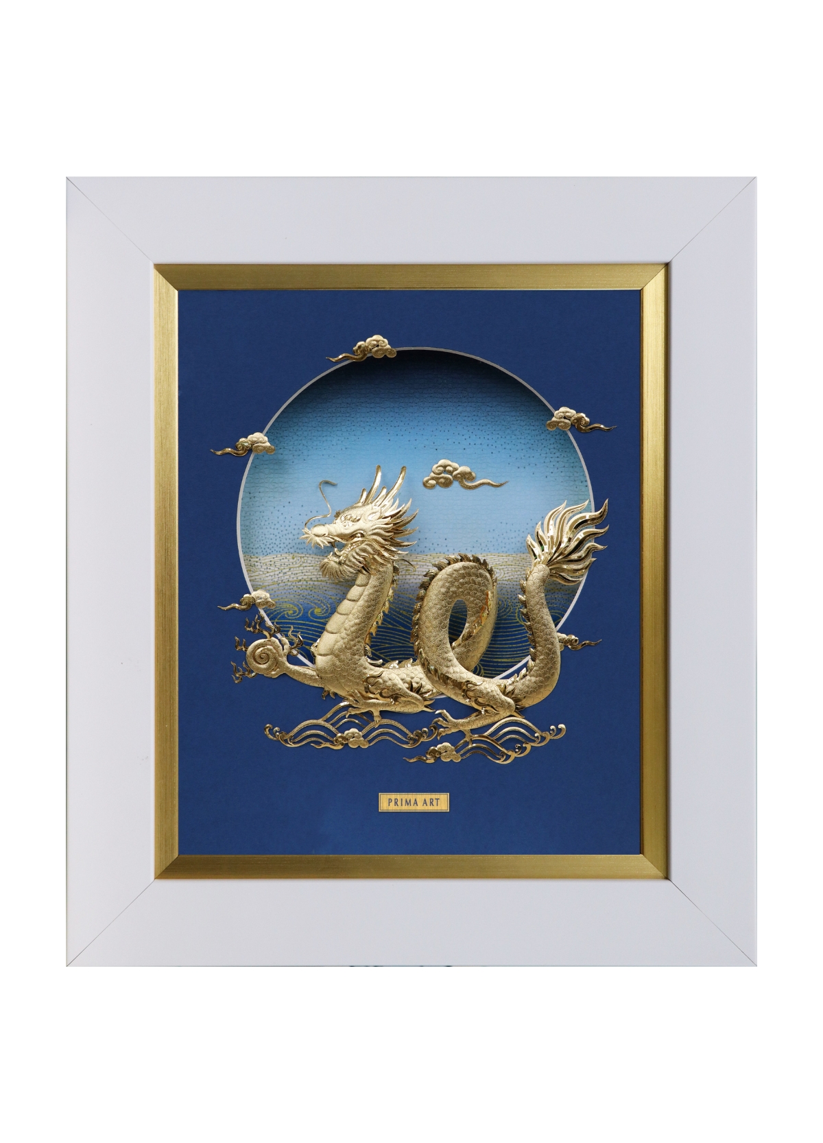 The golden dragon ascends through the clouds with majestic grace, symbolizing limitless strength, wisdom, and prosperity. Framed against the royal blue and white background, this artwork captures a sense of elegance and divine power, making it a timeless centerpiece that brings auspicious energy and sophistication to any home or office.