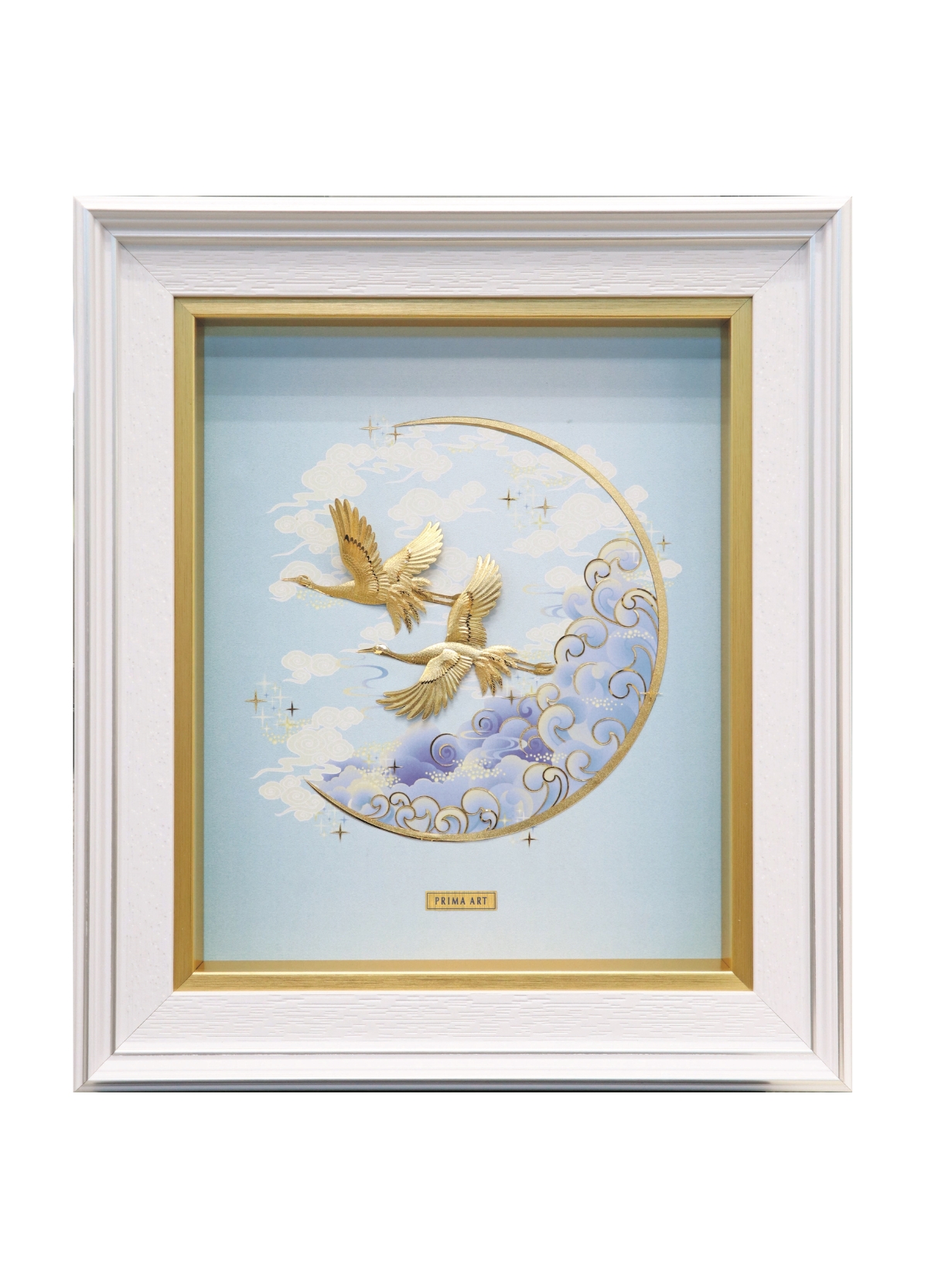 The graceful pair of cranes soaring through the sky symbolizes eternal love, harmony, and prosperity. Revered in Asian culture as a sign of longevity and fidelity, the cranes embody blessings of a life filled with happiness and unity. Crafted in delicate 24K gold sheet and set within an elegant frame, this masterpiece radiates auspicious energy and timeless beauty, making it a cherished centerpiece for celebrating love and meaningful bonds.