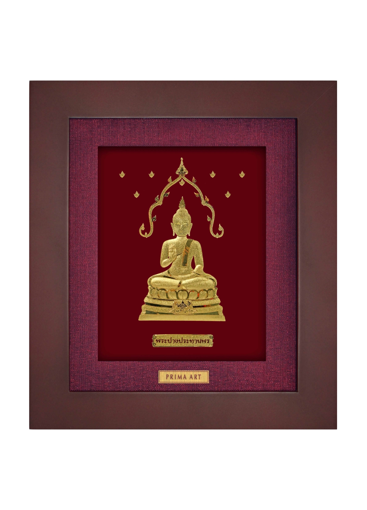 The Blessing Buddha, with one hand raised in the gesture of granting blessings, is a sacred symbol of peace, prosperity, and protection. This 24K gold sheet artwork captures the divine posture with refined detail, radiating serenity and grace. Set against a deep red backdrop and framed in elegant wood, it serves as a timeless piece of spiritual significance, bringing auspicious blessings, harmony, and well-being into any home or sacred space.