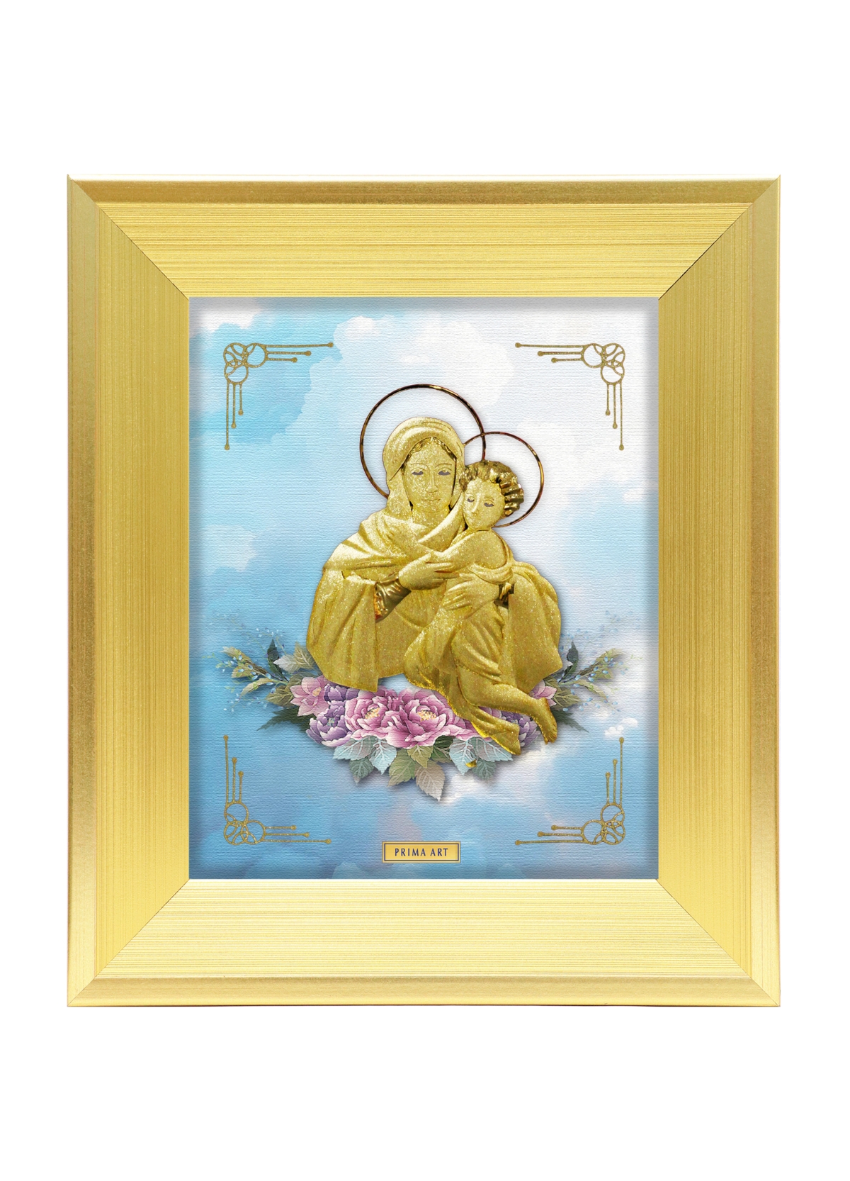 This masterpiece captures the tender bond between Mary and the Child Jesus, a timeless symbol of love, protection, and divine blessings. Crafted with radiant golden artistry, the figures are portrayed with serene elegance, set against a soft sky-blue background adorned with delicate blossoms. The golden frame enhances its sanctity and sophistication, making it not only a sacred image but also a cherished keepsake that brings peace, harmony, and spiritual grace into every home.